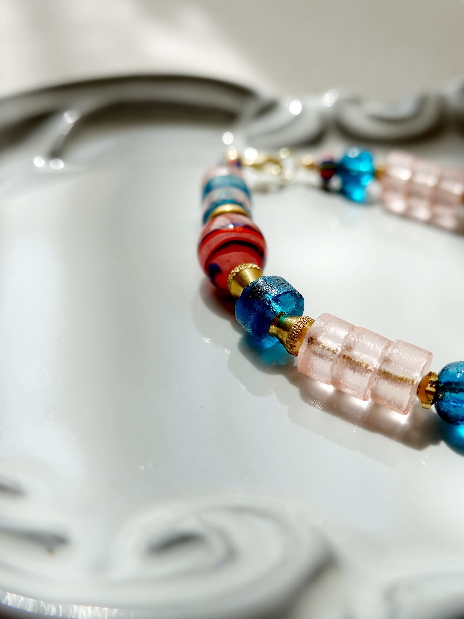 メインには西アジアのガラスビーズを使用し、無地のビーズは中国から。