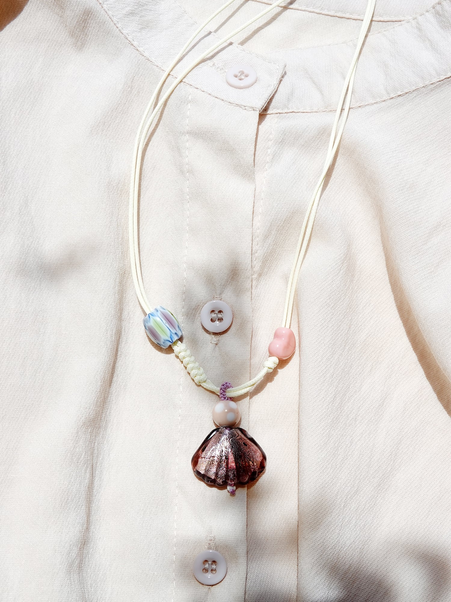 貝殻の形をしたペンダントトップはガラス製で、内側に手作業で銀箔を施しているため、一つとして同じものがない、とても自然な風合いが魅力です。太陽の光を浴びると、格別に美しく、きらきらと輝きます。