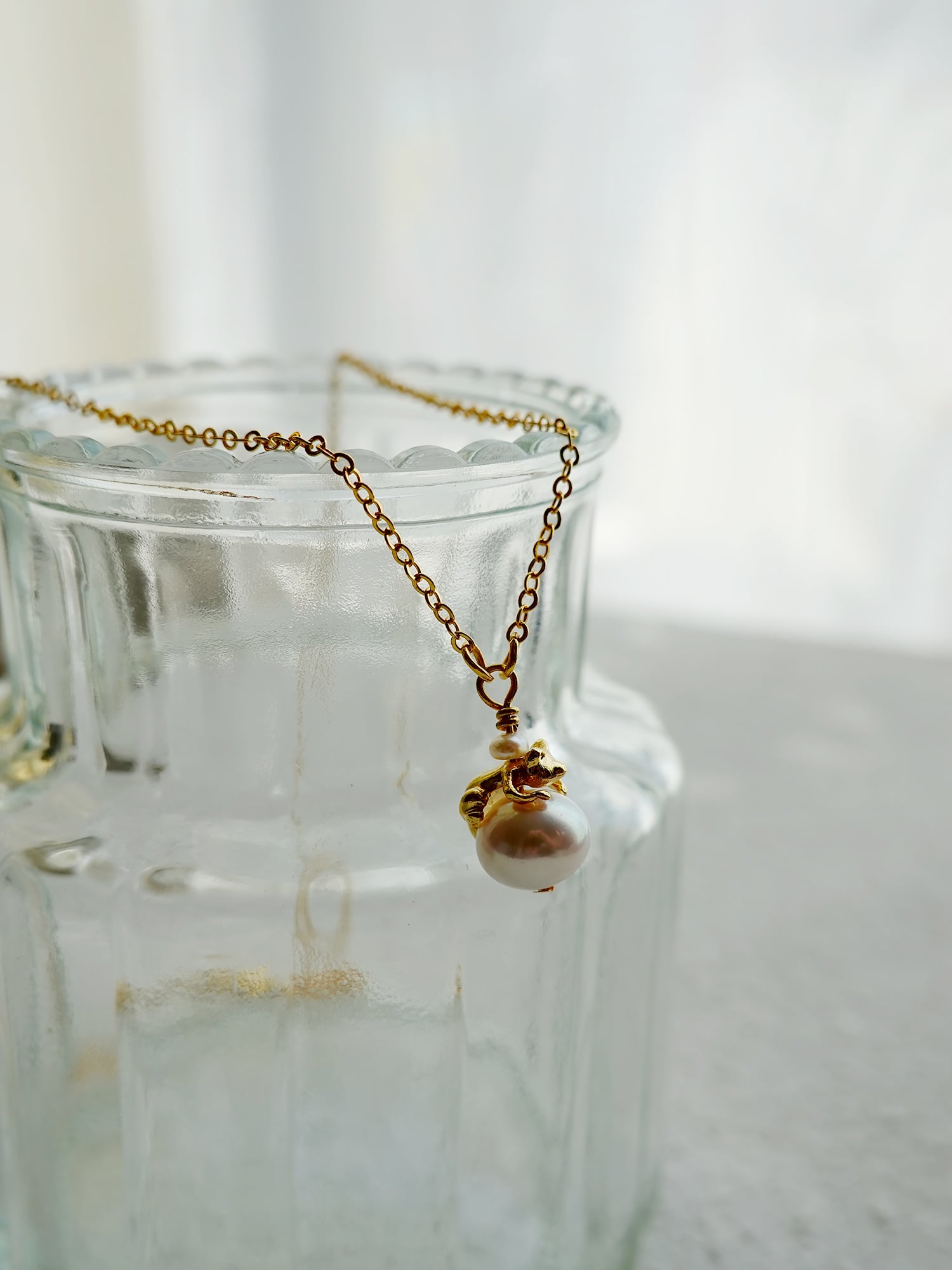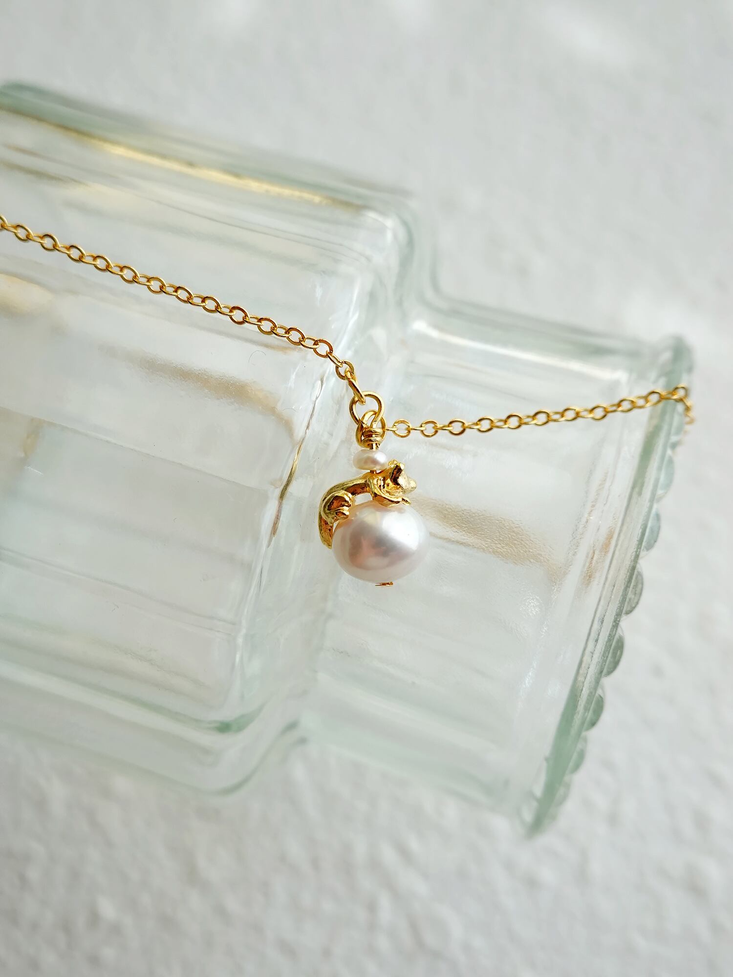 真珠はほんのりとピンクがかった柔らかな光沢を放ち、その瑞々しい質感が猫のゴールドカラーと美しく調和しています。