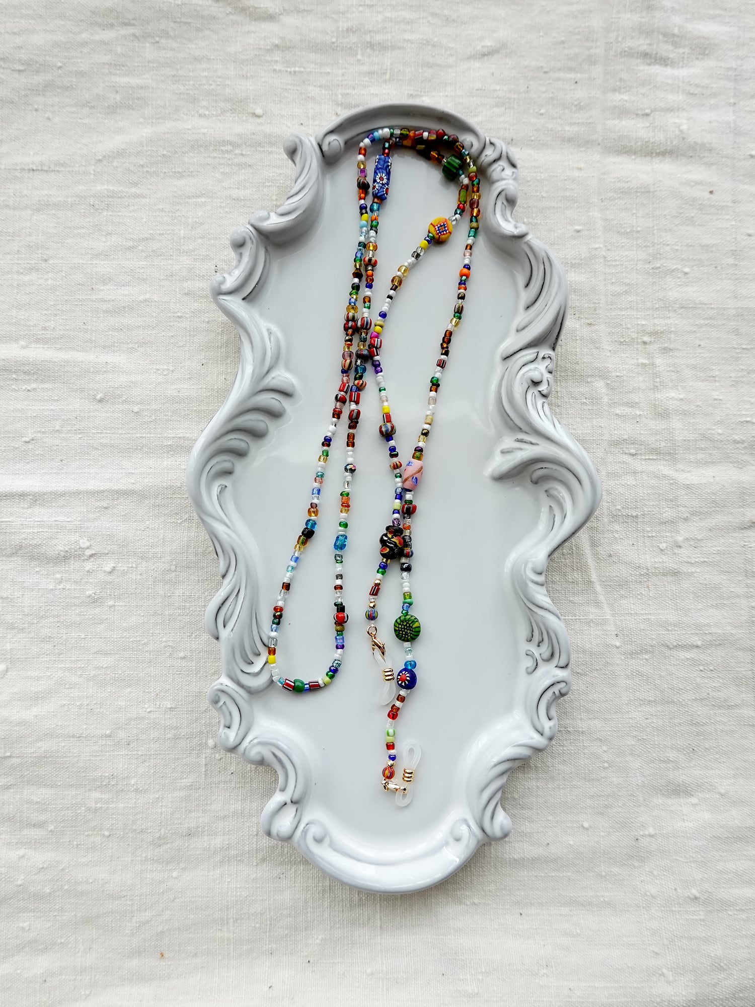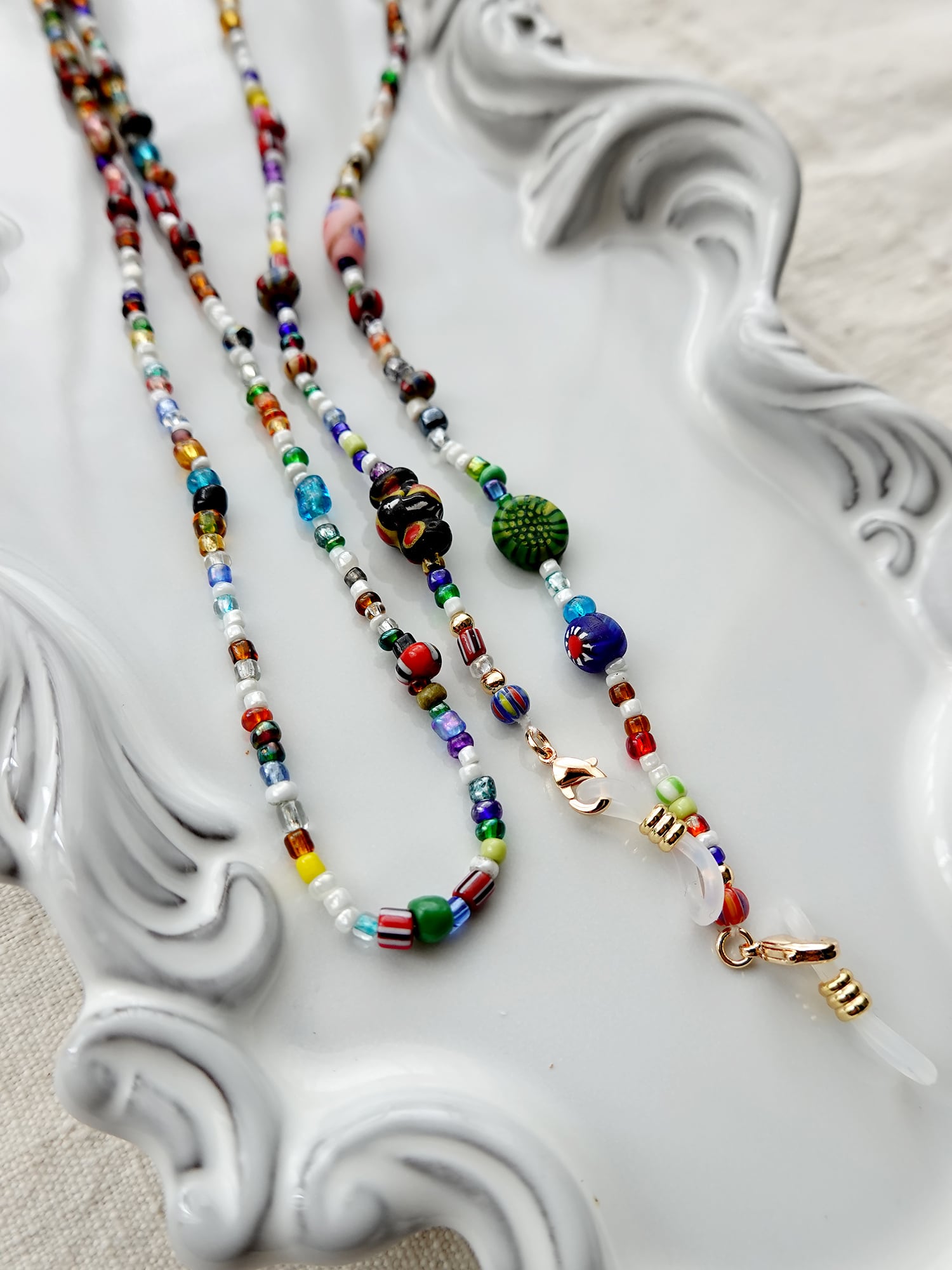 眼鏡・マスクチェーン、多連ブレスレット、2連ネックレス、さらにはミニバッグのストラップとしても。アイデア次第で使い道が広がる、自信作のマルチアイテムです。