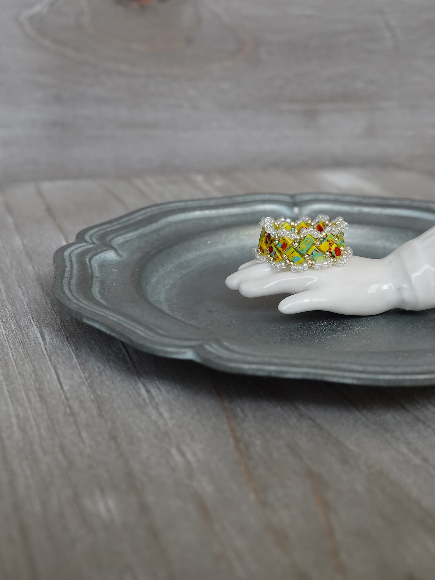 リングの縁には透明感のあるビーズを編み込み、